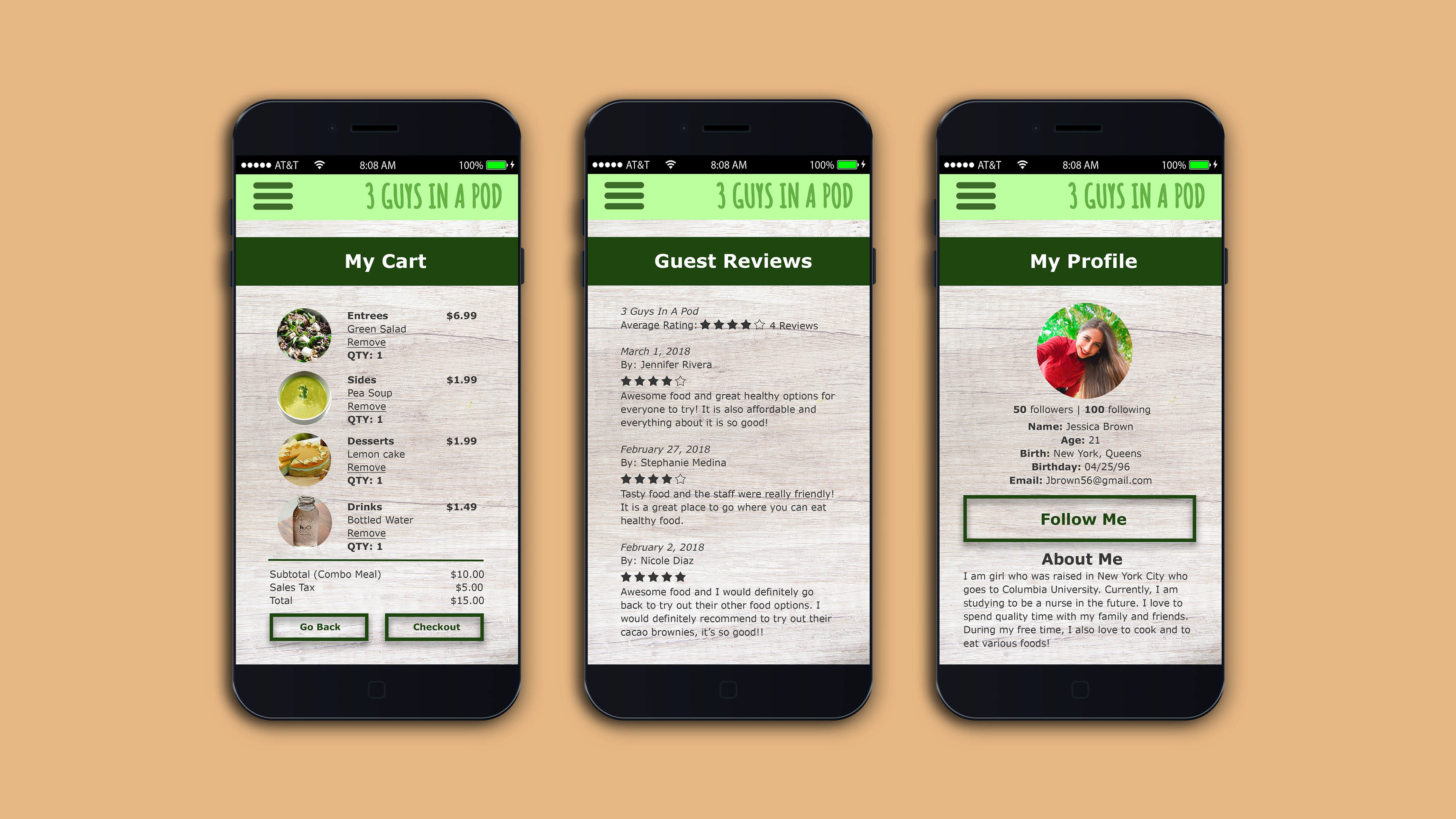 3 Guys in a Pod is a mobile ordering app created to provide healthy and nutritional food for people on-the-go. It is a food truck that serves lunch and dinner with ingredients 100% made from fruits and vegetables. The goal was to communicate a healthy, fresh, and delicious style, and the app will present multiple food options for users to order. I incorporated images of fresh vegetables and fruits with green hues across the mobile app.