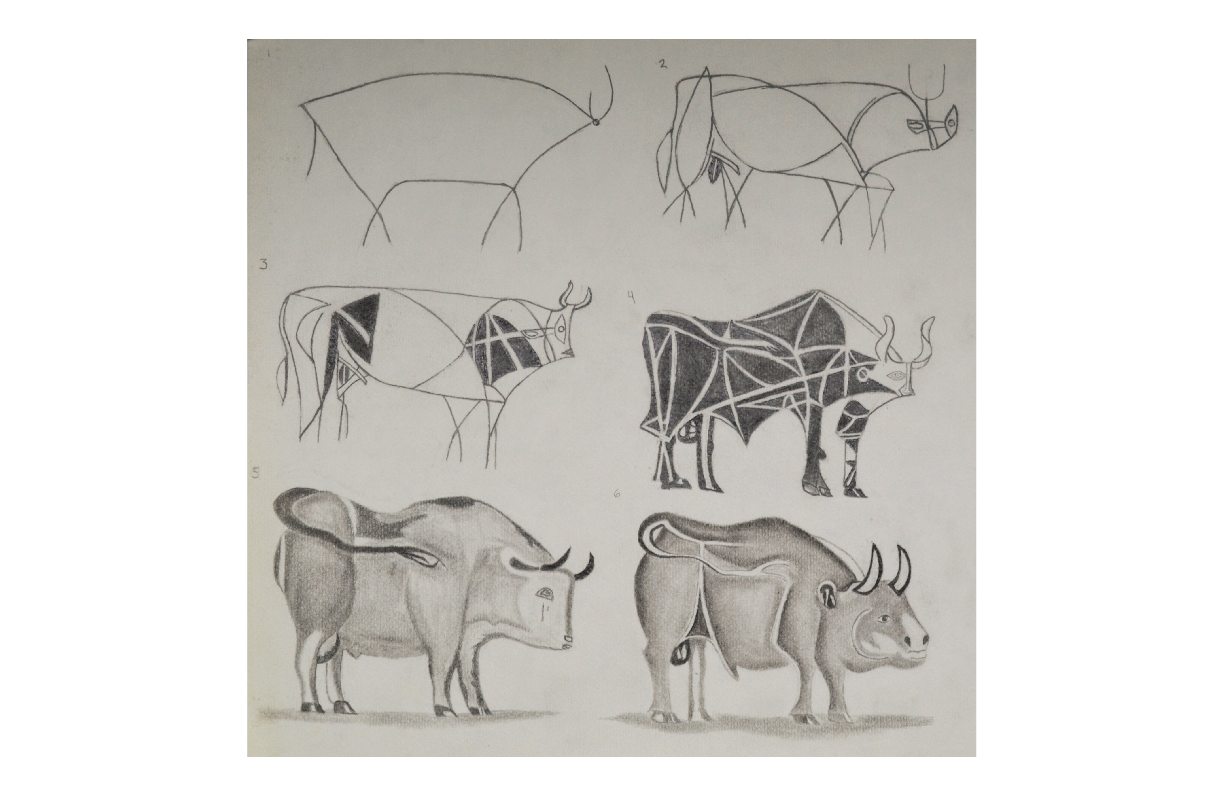 A progressive drawing of a bull with the usage of various graphite pencils.